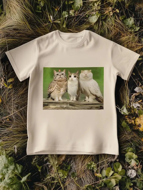 Whole cat fam energy. Funny, cute, and kinda wholesome. A Tee that says, "Yes, I'm owned by cats."