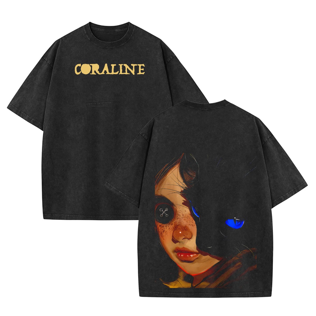 Creepy but chic. This Tee takes Coraline vibes and flips them into a retro fashion statement. Movie buffs? You need this.